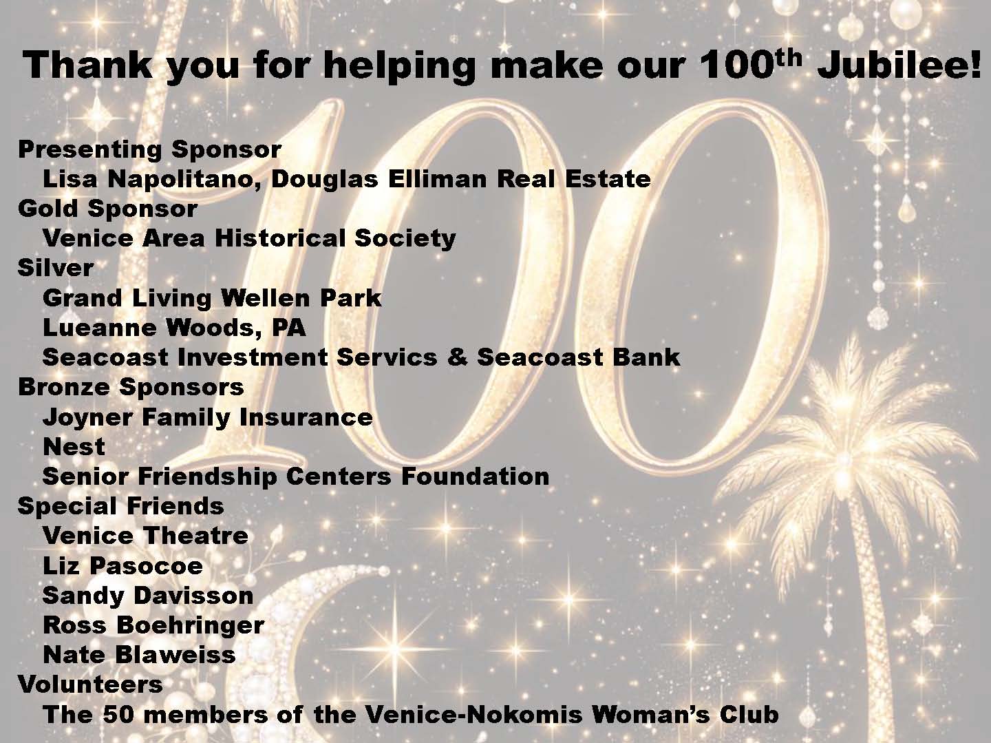 March 20, 2026 The amazing evening celebrating our 100th Anniversary, supported scholarships for Venice High School women THANK YOU Plantation Golf and Country Club! (see our event sponsors & official acknowledgements below) SPECIAL THANK YOU TO...